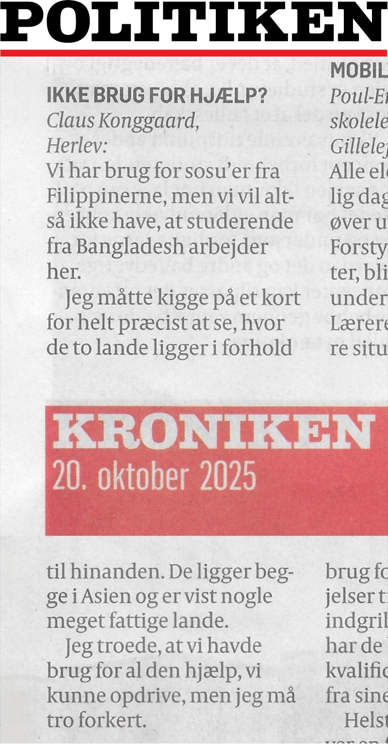 Jeg måtte kigge på kort for helt præcist at se hvor de to lande lå i forhold til hinanden. De ligger begge i Asien og er vist nogle meget fattige lande. Jeg troede vi havde brug for al den hjælp, vi kunne opdrive, men det er nok fordi min IQ er for lav og jeg har heller ikke en studentereksamen. Jeg er bare uddannet datamekaniker, men med flotte resultater. |